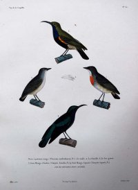Dicée à poitrine rouge. (Dicæum erythrothorax, N.) 1. Le mâle. 2. La femelle. A. Le bec grossi. 3. Soui-Manga Zénobie. (Cinnyris Zenobia, N.) 4. Soui-Manga Aspasie. (Cinnyris Aspasia, N.) Ile de Bourou: Nouv. Guinée. | oiseaux |