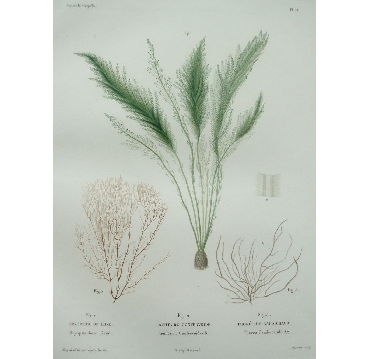 Fig. 1 Bryopside de Rose. Bryopsis Rosæ. Gaud Fig.2. Trinitaire Confervoide. Trinitaria Confervoides. B. Fig.3. Thorée de Gaudichaud. Thorea Gaudichaudii. Ag.