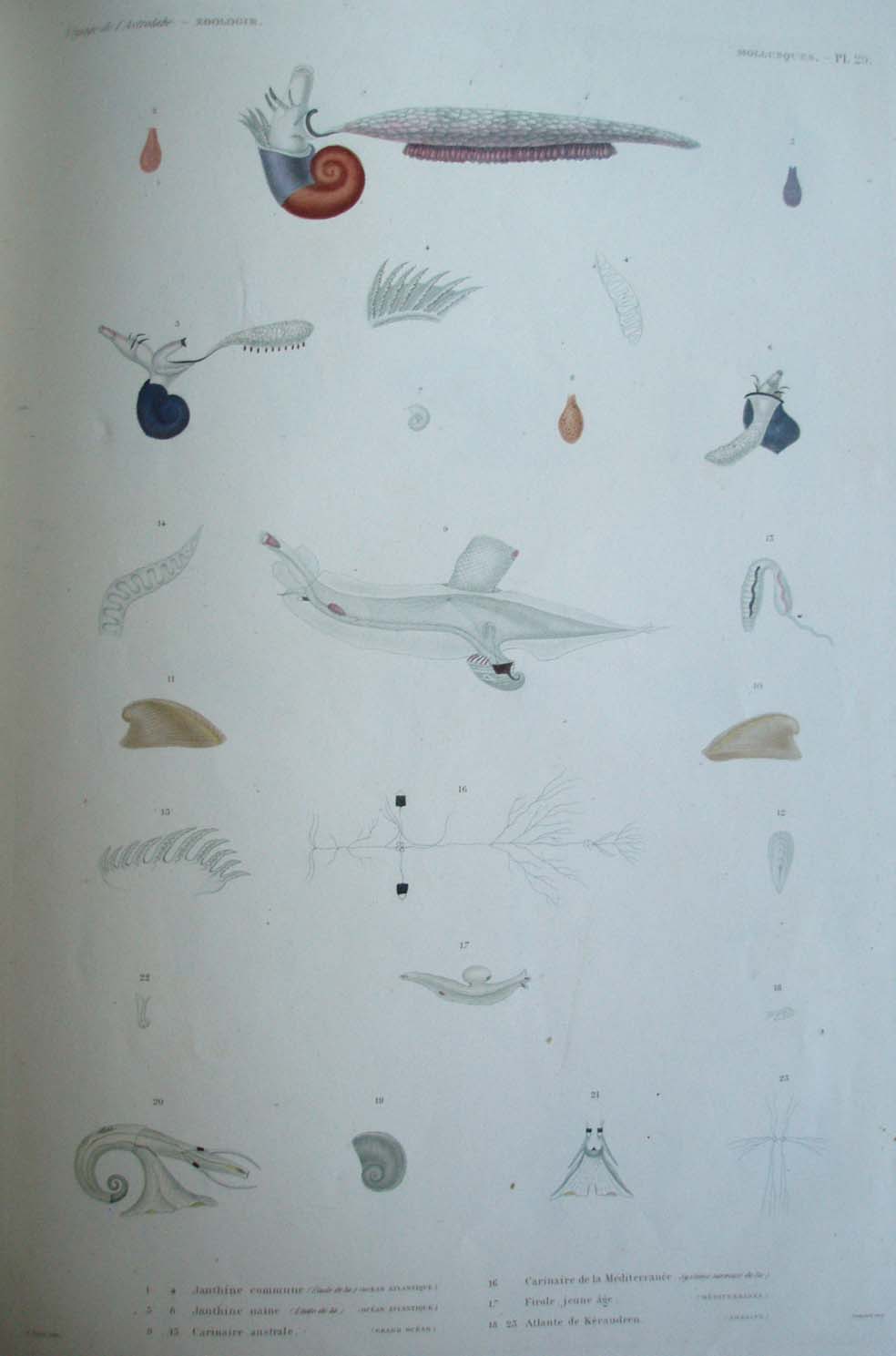 1. 4. Janthine commune (Étude de la) (Océan Atlantique) 5. 8. Janthine naine (Étude de la) (Océan Atlantique) 9. 13. Carinaire australe. (Grand océan) 16. Carinaire de la Méditerranée (Système nerveux de la) 17. Firole, jeune âge. (Méditerranée) 18. 23. Atlante de Kéraudren (Amboine)