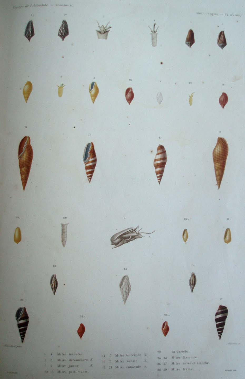 1. 4. Mitre marbrée. 5. 6. Mitre de Vanikoro. N. 7. 9. Mitre jaune. N. 10.13. Mitre petit-taon. 14. 15. Mitre buccinée. N. 16. 17. Mitre zonale. N. 18. 21. Mitre conovule. N. 22. sa variété. 23. 25. Mitre flammée. 26. 27. Mitre noire et blanche. 28. 29. Mitre fraise.