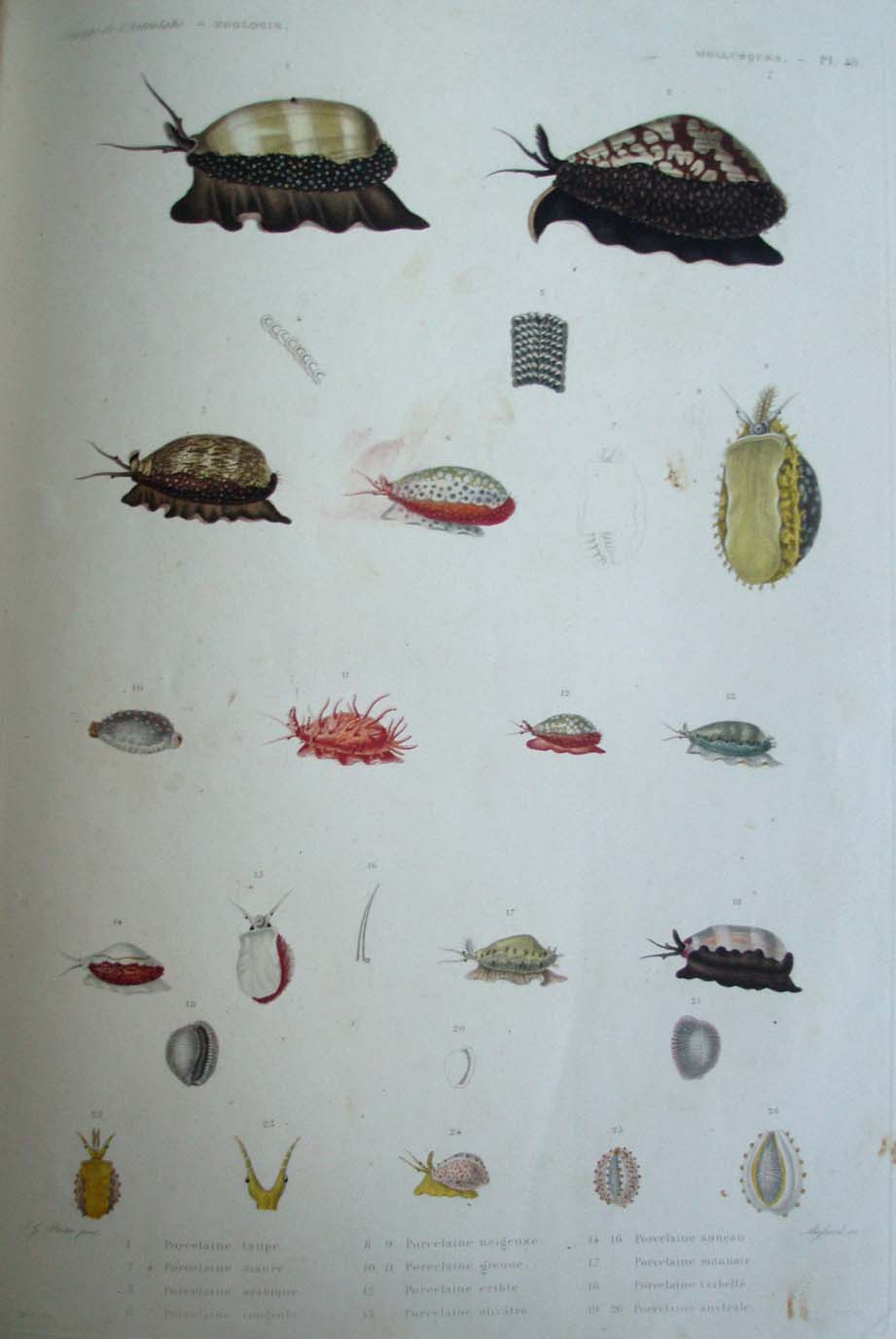 1. Porcelaine taupe. 2. 4. Porcelaine maure. 5. Porcelaine arabique. 6. 7. Porcelaine rougeole. 8. 9. Porcelaine neigeuse. 10. 11. Porcelaine grenue. 12. Porcelaine crible. 13. Porcelaine olivâtre. 14. 16. Porcelaine anneau. 17. Porcelaine monnaie. 18. Porcelaine isabelle. 19. 26. Porcelaine australe.