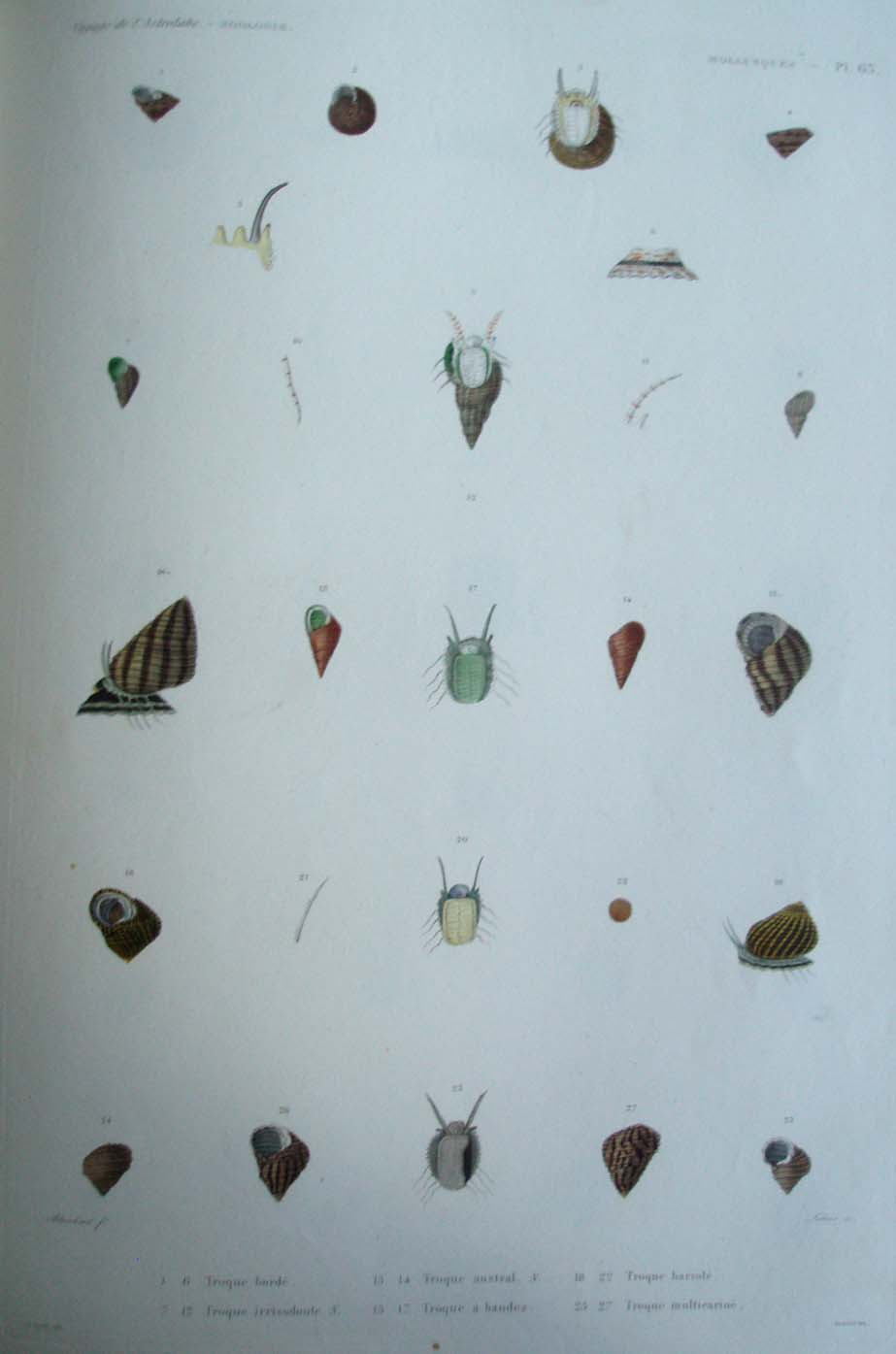 1. 6. Troque bordé. 7. 12. Troque irrisodonte. N. 13. 14. Troque austral. N. 15. 17. Troque à bandes. 18. 22. Troque bariolé. 23. 27. Troque multicariné.