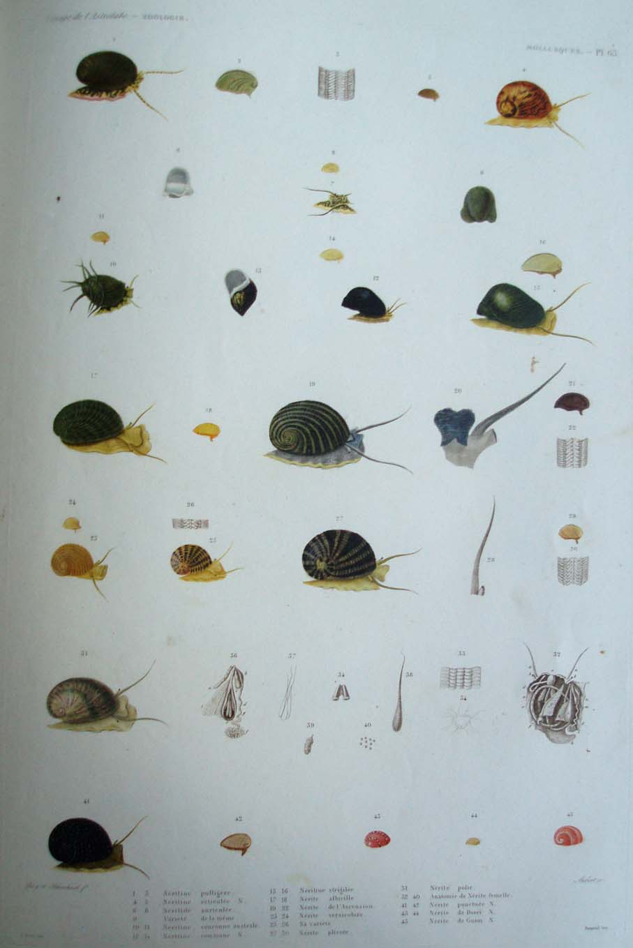 1. 3. Néritine pulligère. 4. 5. Néritine reticulée. N. 6. 8. Néritine auriculée. 9. Variété de la même. 10. 11. Néritine couronne australe. 12. 14. Néritine commune. N. 15. 16. Néritine strigilée. 17. 18. Nérite albicille. 19. 22. Nérite de l’Ascension. 23. 24. Nérite versicolore. 25. 26. Sa variété. 27. 30. Nérite plissée. 31. Nérite polie. 32. 40. Anatomie de Nérite femelle. 41. 42. Nérite ponctuée. N. 43. 44. Nérite de Doreï. N. 45. Nérite de Guam. N.