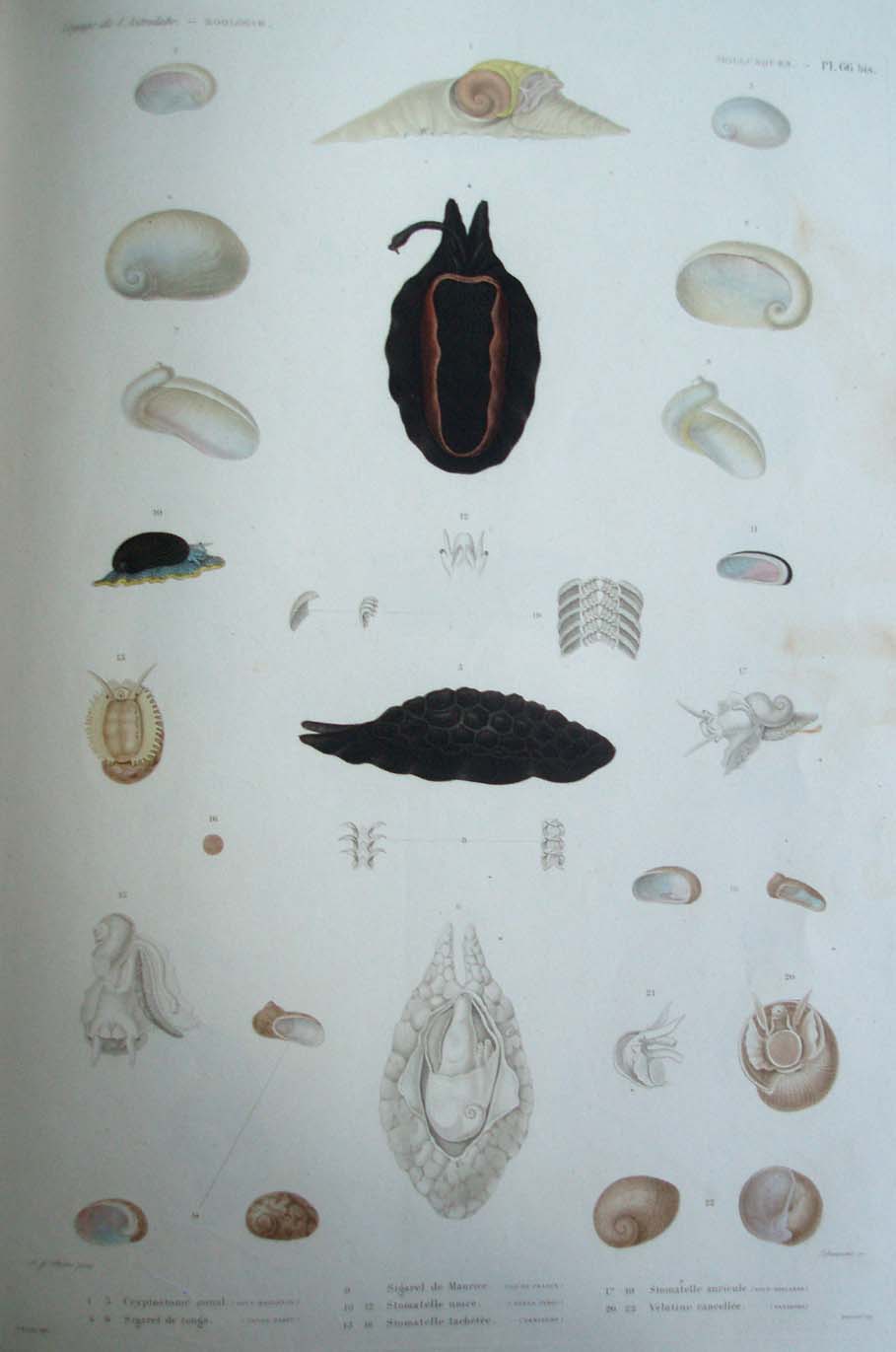 1. 3. Cryptostome zônal. (Nouv. Hollande) 4. 8. Sigarel de tonga. (Tonga-Tabou) 9. Sigarel de Maurice. (Île-de-France) 10. 12. Stomatelle noire. (Tonga-Tabou) 13. 16. Stomatelle tachetée. (Vanikoro) 17. 19. Stomatelle auricule. (Nouv-Hollande) 20. 22. Velutine cancellée. (Vanikoro)