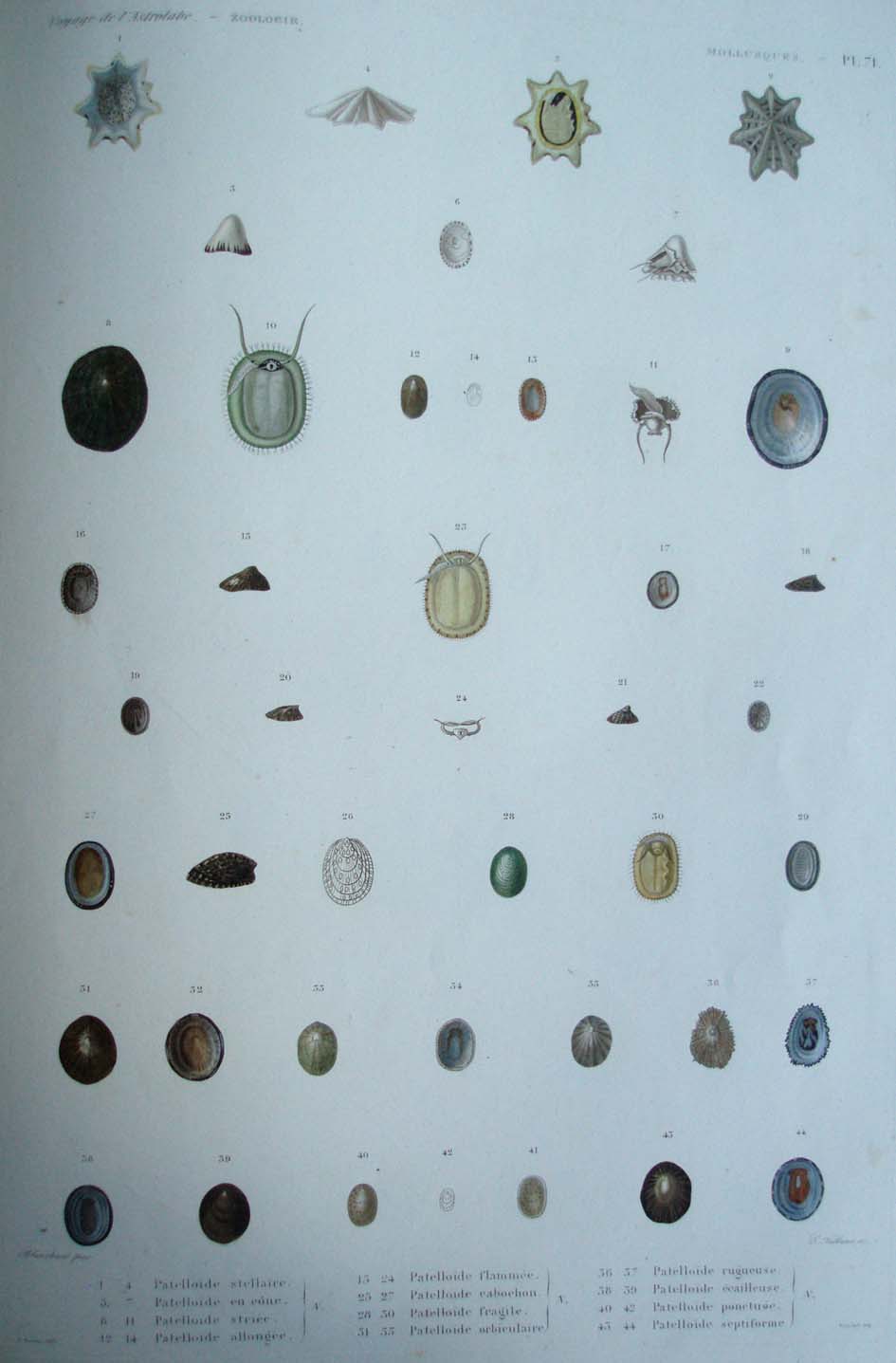 1. 4. Patelloïde stellaire. N. 5. 7. Patelloïde en cône. N. 8. 11. Patelloïde striée. N. 12. 14. Patelloïde allongée. N. 15. 24. Patelloïde flammée. N. 25. 27. Patelloïde cabochon. N. 28. 30. Patelloïde fragile. N. 31. 35. Patelloïde orbiculaire. N. 36. 37. Patelloïde rugueuse. N. 38. 39. Patelloïde écailleuse. N. 40. 42. Patelloïde ponctuée. N. 43. 44. Patelloïde septiforme. N.