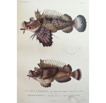 Pélor à Filamens. (Pelor filamentosum, Cuv. poiss. tom. IV. pag. 428.) Île de France. 1. A. Nageoire ventrale. 2. Pélor Obscur. (Pelor obscurum, Cuv. poiss. tom. IV. pag. 436.) Nouv. Irlande.