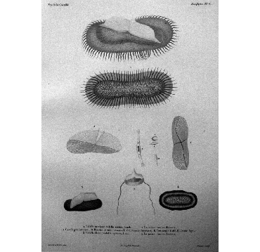 Vélelle mutique; velella mutica, Lamk. 2. La même vue en dessous. A. Cartilages internes. B. Bouche et tube stomacal. C.C. Suçoirs buccaux. D. Tentacule isolé. E. Jeune âge. 3. Vélelle bleue ; velella cyanea, Less. 4. La même vue en dessous.