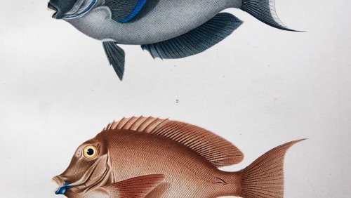 Poissons No. 27. Fig. 1. Acanthure Eparai. (Acanthurus eparai, Less.) Ile d'O-Taiti. Fig. 2. Acanthure Fuligineux. (Acanthurus fuliginosus, Less.) Iles Carolines.