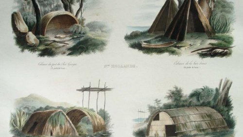 En haut, les cabanes des parties différentes de la Nouvelle-Hollande, une avec une vieille pirogue à côté. En bas, les cabanes avec leurs greniers des parties différentes de la Nouvelle-Zélande. Toutes les cabanes sont entourées par les arbres, les rochers, les fougéres et la végétation typique des endroits nommés.