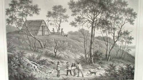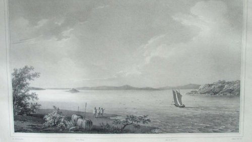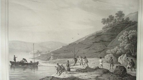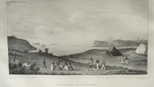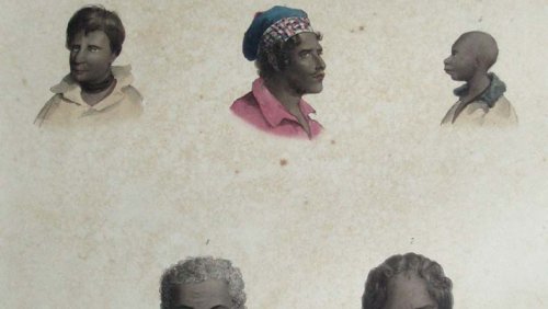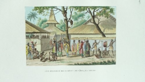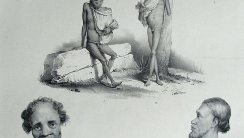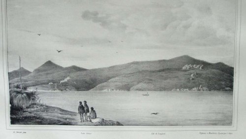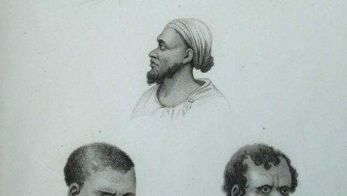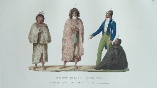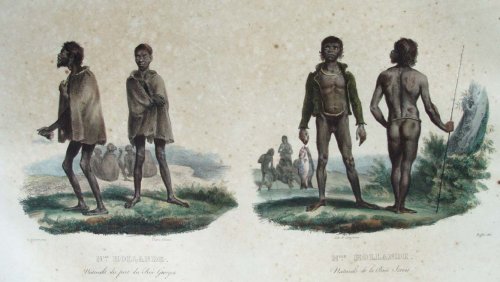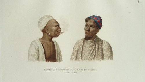 Deux Rajahs de la Nouvelle-Guinée, vus de profil. Le Rajah à gauche est moustachu, chauve, portant un béret blanc, une chemise blanche, ouverte, une pendant d’oreille et un cigare dans sa bouche. Le Rajah à droite barbue, portant un béret bleu et rouge, une chemise blanche à longues manches et à col montant.