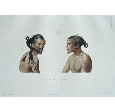 Deux habitants de l’île Oualan. Deux hommes nus, tatoués et barbus portants des coiffures, des pendants d’oreilles et des colliers différents.