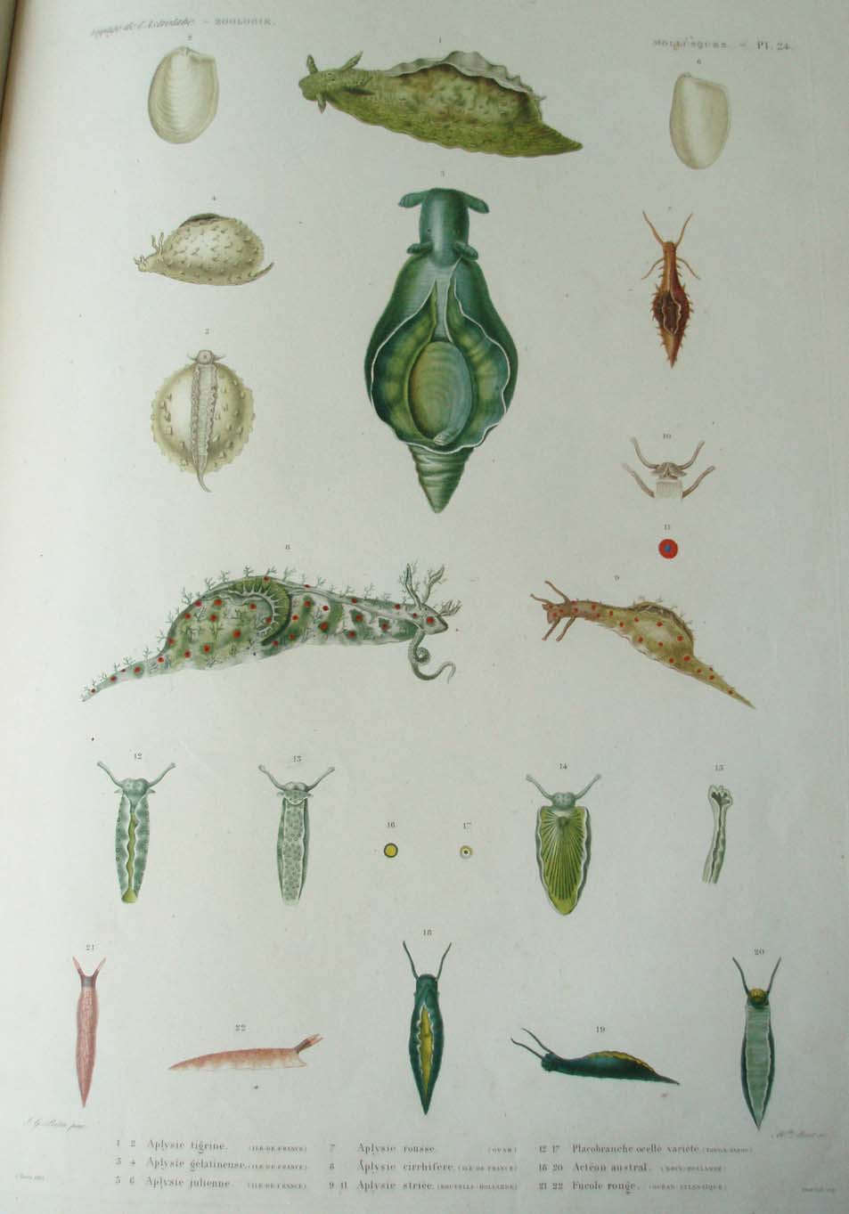 1. 2. Aplysie tigrine. (Île de France) 3. 4. Aplysie gélatineuse. (Île de France) 5. 6. Aplysie julienne. (Île de France) 7. Aplysie rousse. (Guam) 8. Aplysie cirrhifère. (Île de France) 9. 11. Aplysie striée. (Nouvelle-Hollande) 12. 17. Placobranche ocellé, variété. (Tonga-Tabou) 18. 20. Actéon austral. (Nouv-Hollande) 21.22. Fucole rouge. (Océan Atlantique)