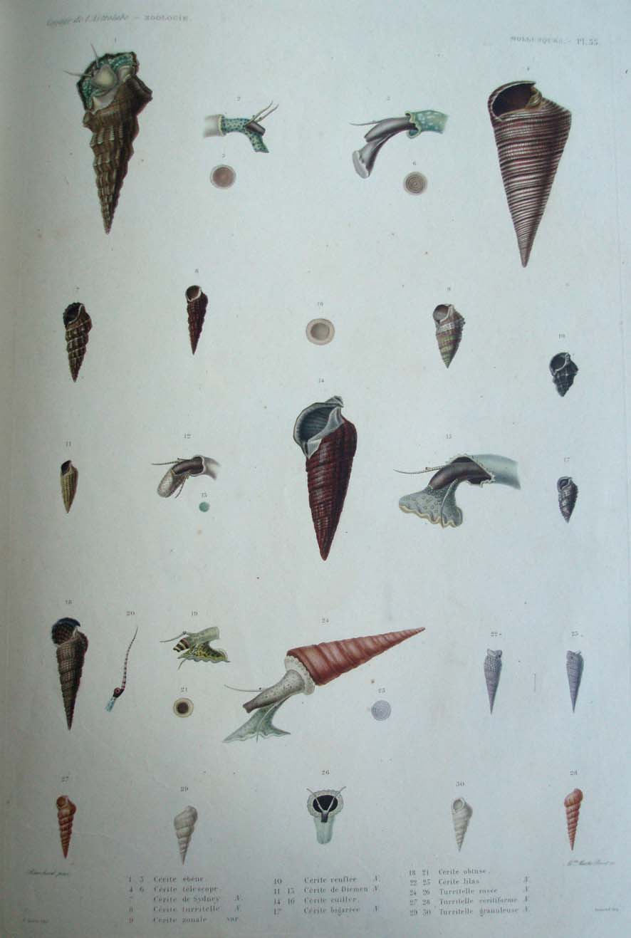 1. 3. Cérite ébène. 4. 6. Cérite télescope. 7. Cérite de Sydney. N. 8. Cérite turritelle. N. 9. Cérite zonale. var. 10. Cérite renflée. N. 11. 13. Cérite de Diemen. N. 14. 16. Cérite cuiller. 17. Cérite bigarrée. N. 18. 21. Cérite obtuse. 22. 23. Cérite lilas. N. 24. 26. Turritelle rosée. N. 27. 28. Turritelle ceritiforme. N. 29. 30. Turritelle granuleuse. N.