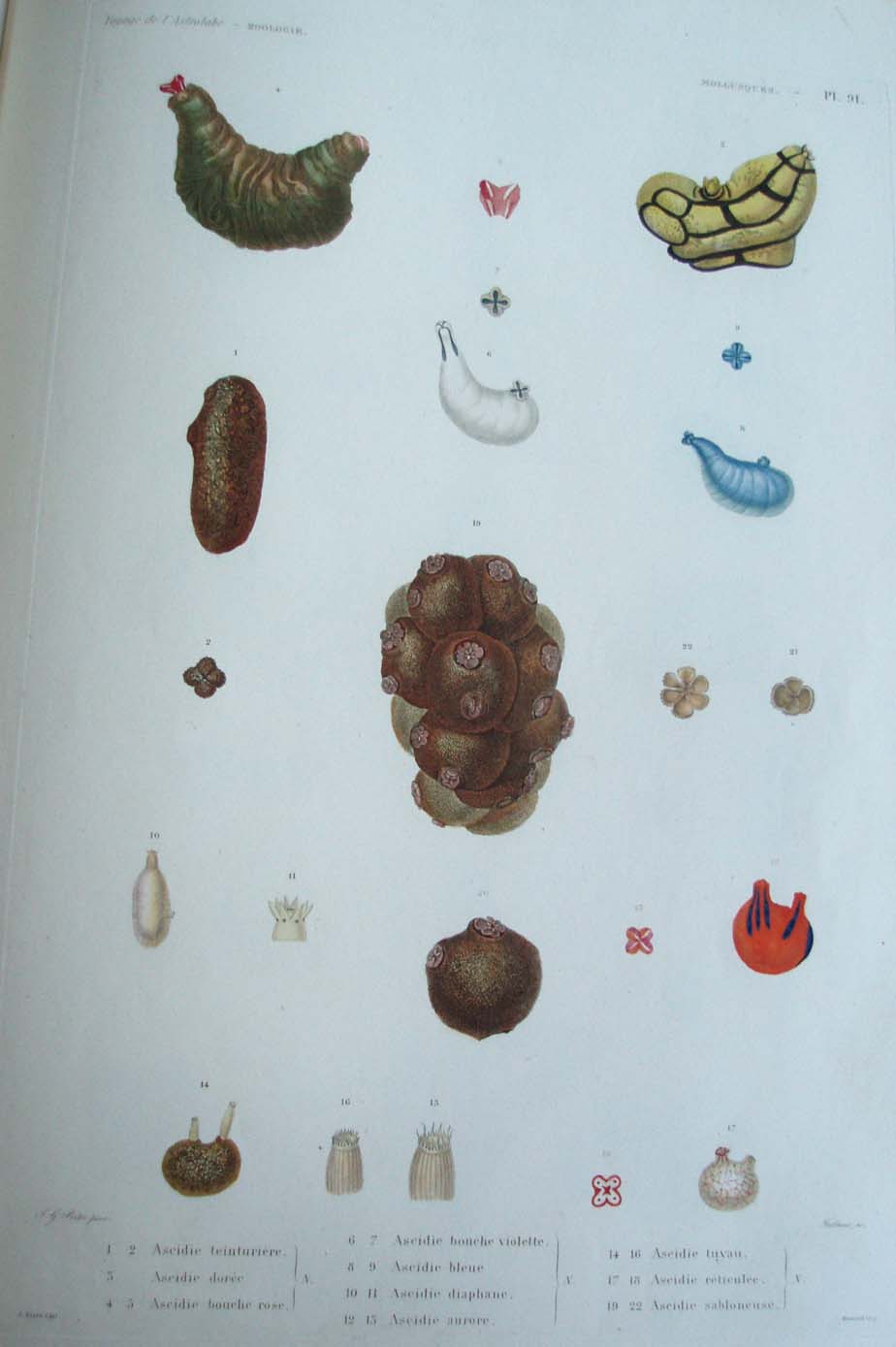 1. 2. Ascidie teinturière. N. 3. Ascidie dorée. N. 4. 5. Ascidie bouche rose. N. 6. 7. Ascidie bouche violette. N. 8. 9. Ascidie bleue. N. 10. 11. Ascidie diaphane. N. 12. 13. Ascidie aurore. N. 14. 16. Ascidie tuyau. N. 17. 18. Ascidie réticulée. N. 19. 22. Ascidie sabloneuse. N.